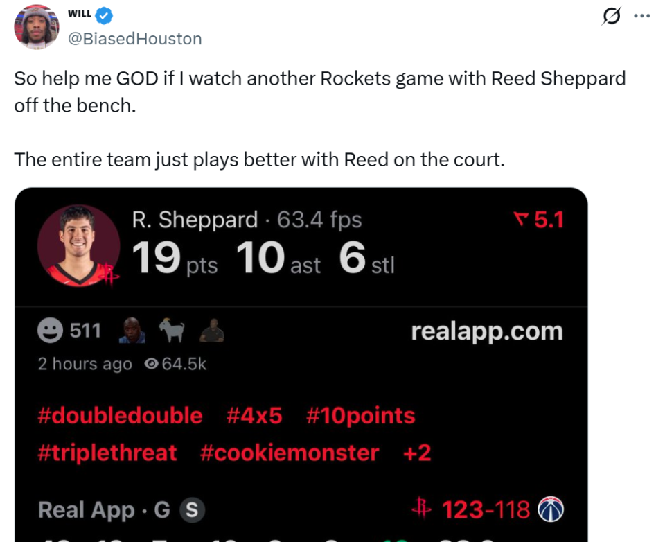 火箭媒体人BiasedHouston也果断发文力挺谢泼德:“如果谢泼德再替补作战,我绝对不会再看火箭队比赛,他在场时火箭队表现明显更好。”
